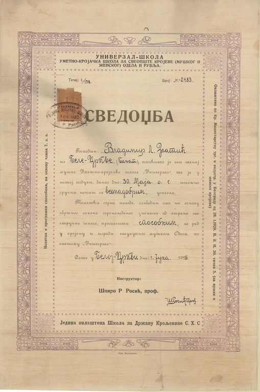 Svedodžba Univerzal-škola - umetničko krojačke školem, 1925. godine